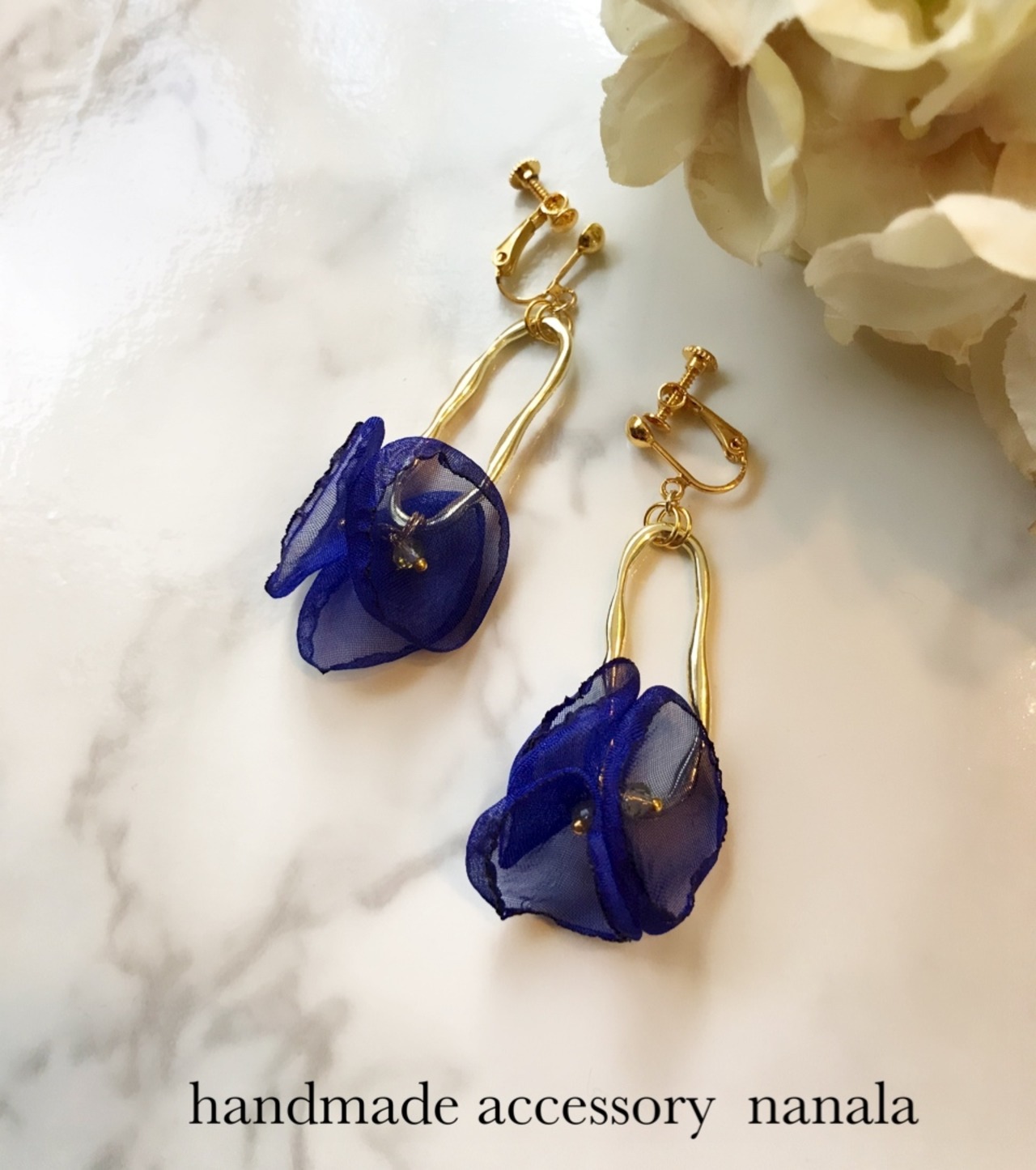 ゴールドの楕円型のリングに、綺麗なブルーのお花をぶら下げた、大人可愛いアクセサリーです。